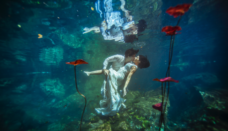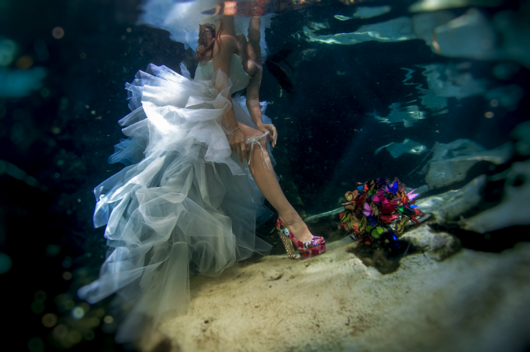 Once the big day is over, you don’t have to worry about keeping the dress clean anymore! Whether it’s one day, one week or a few years after, having a « trash the dress » photo session will give you precious and artistic memories to look at. Here are some pictures of one of our brides who chose to have a wonderful « Trash the dress » session in a cenote. In addition, we can refer you to the best photographers specialists in Trash the Dress of the Riviera Maya.